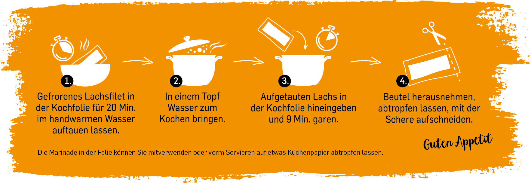 Mit unserem neuartigen Lachsfilet in Kochfolie bieten Sie Ihren Gästen vollsaftigen Lachsgenuss – schnell, unkompliziert und zuverlässig. Nach dem Auftauen ist das Filet in nur 9 Minuten servierfertig.
